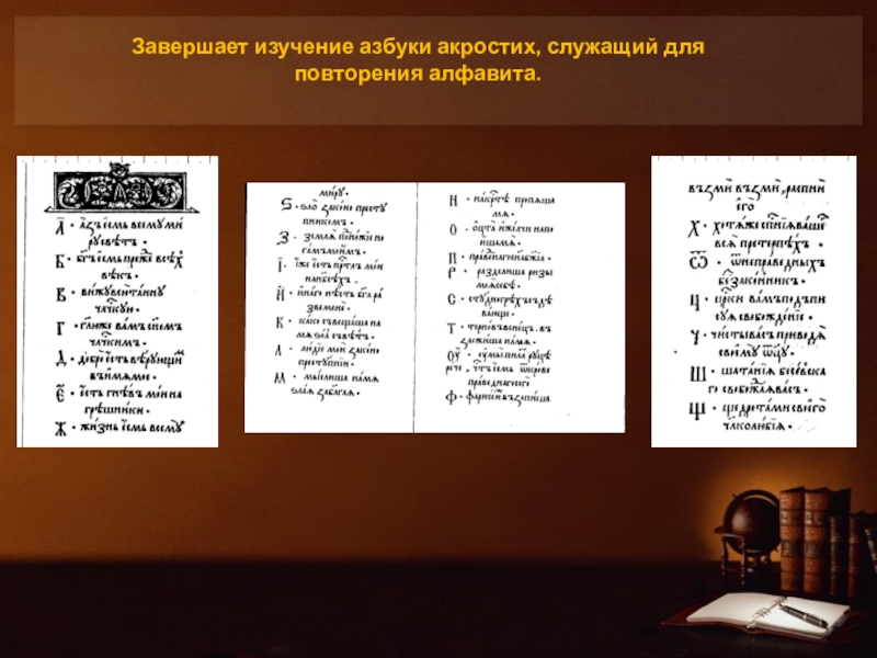 Слайд 24Завершает изучение азбуки акростих, служащий для повторения алфавита.
