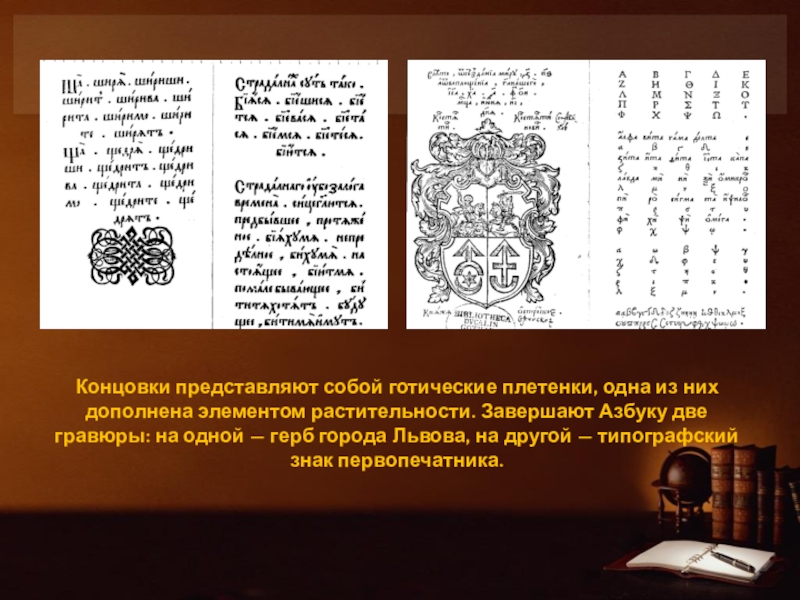 Завершают Азбуку две гравюры: на одной — герб города Львова, на другой — типографский знак первопечатника.