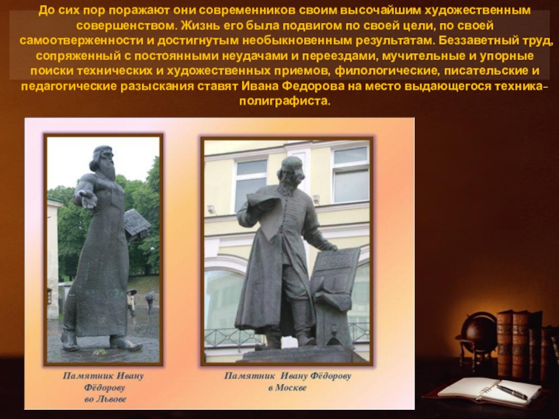 его была подвигом по своей цели, по своей самоотверженности и достигнутым необыкновенным результатам. Беззаветный труд, сопряженный с постоянными неудачами и переездами, мучительные и упорные поиски технических и художественных приемов, филологические, писательские и педагогические разыскания ставят Ивана Федорова на место выдающегося техника-полиграфиста.