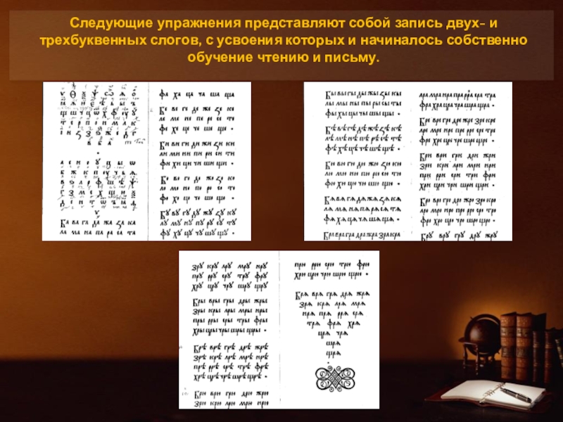 Слайд 14На первом этапе обучения применялись различные рукописные азбуки, в частности, «Азбука