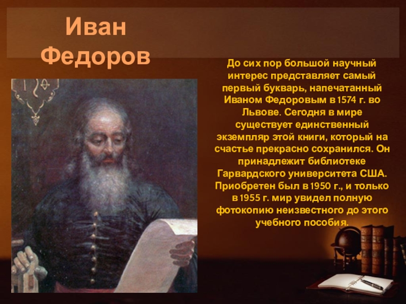 Слайд 16До сих пор большой научный интерес представляет самый первый букварь, напечатанный