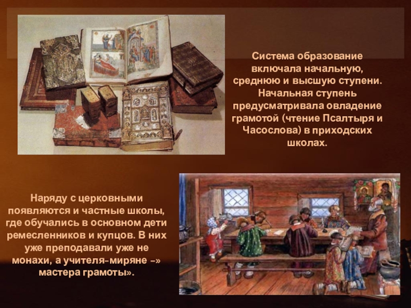 Наряду с церковными появляются и частные школы, где обучались в основном дети ремесленников и купцов. В них уже преподавали уже не монахи, а учителя-миряне –»мастера грамоты».