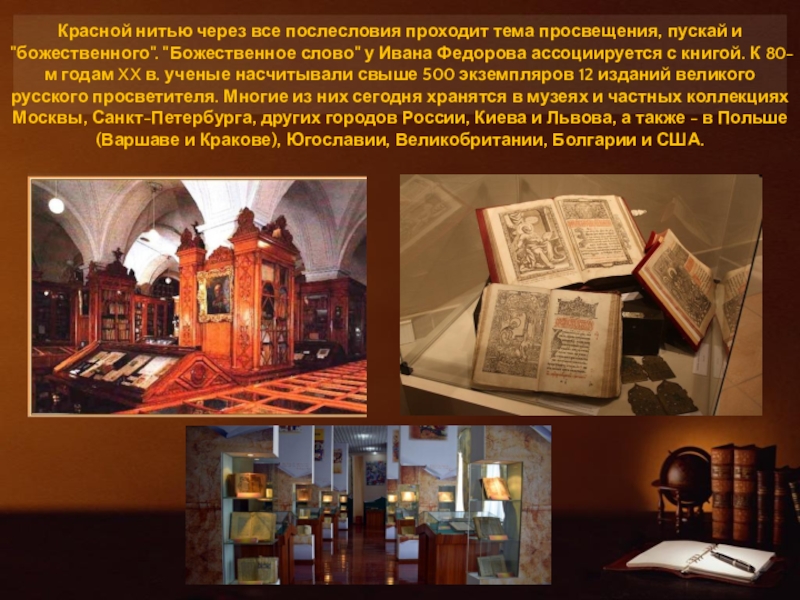 "Божественное слово" у Ивана Федорова ассоциируется с книгой. К 80-м годам XX в. ученые насчитывали свыше 500 экземпляров 12 изданий великого русского просветителя. Многие из них сегодня хранятся в музеях и частных коллекциях Москвы, Санкт-Петербурга, других городов России, Киева и Львова, а также - в Польше (Варшаве и Кракове), Югославии, Великобритании, Болгарии и США.