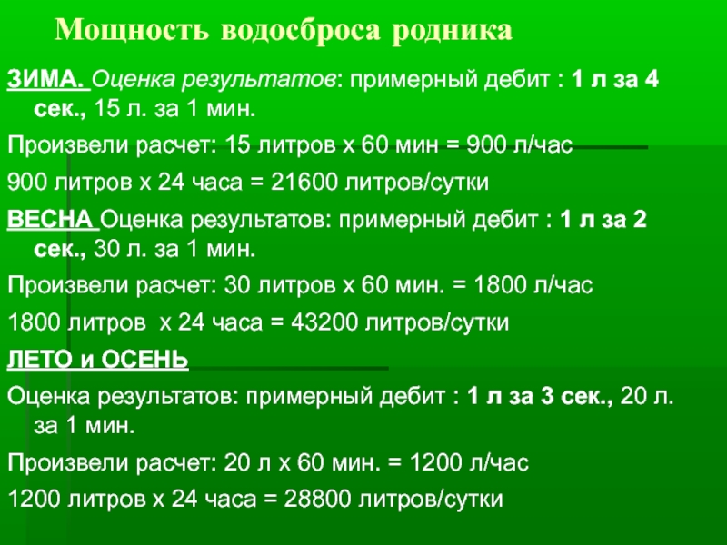 ВЕСНА Оценка результатов: примерный дебит : 1 л за 2 сек., 30 л. за 1 мин.