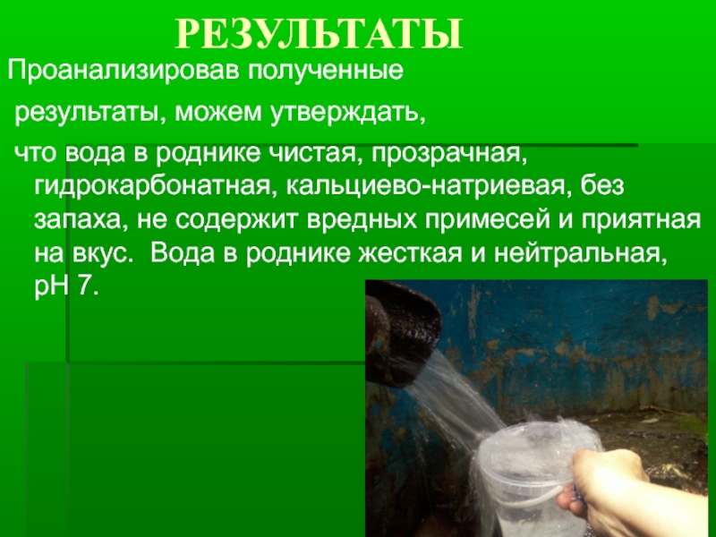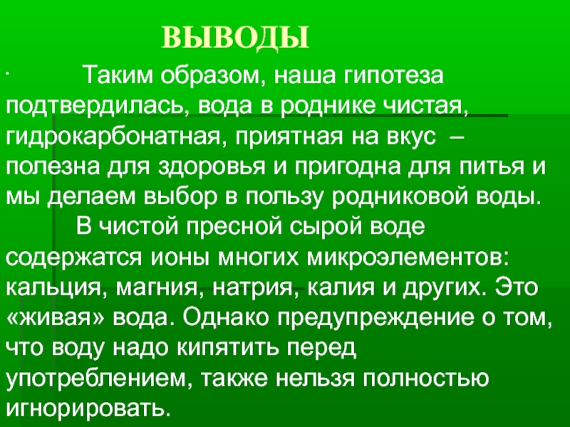 Таким образом, наша гипотеза подтвердилась, вода в роднике чистая, гидрокарбонатная, приятная на вкус – полезна для здоровья и пригодна для питья и мы делаем выбор в пользу родниковой воды.