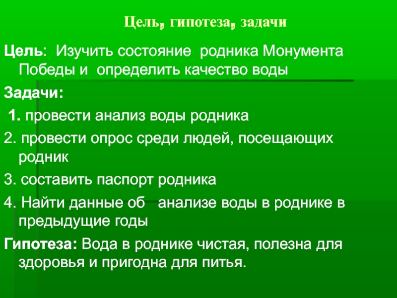 Гипотеза: Вода в роднике чистая, полезна для здоровья и пригодна для питья.