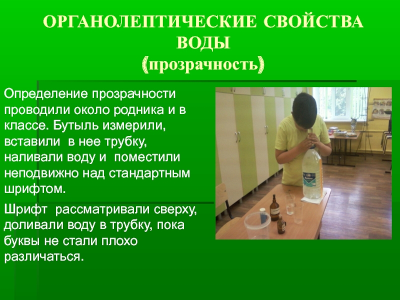 Определение прозрачности проводили около родника и в классе. Бутыль