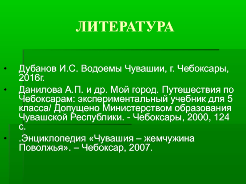 город. Путешествия по Чебоксарам: экспериментальный учебник для 5 класса/ Допущено Министерством образования Чувашской Республики. - Чебоксары, 2000, 124 с.