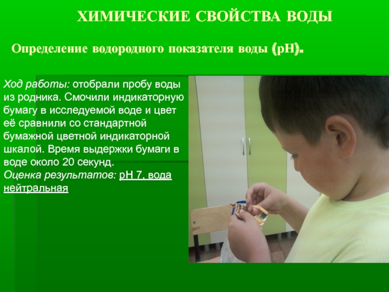 Ход работы: отобрали пробу воды из родника. Смочили индикаторную бумагу в исследуемой воде и цвет её сравнили со стандартной бумажной цветной индикаторной шкалой. Время выдержки бумаги в воде около 20 секунд.