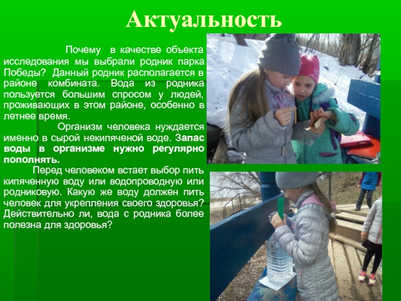 выбрали родник парка Победы? Данный родник располагается в районе комбината. Вода из родника пользуется большим спросом у людей, проживающих в этом районе, особенно в летнее время.