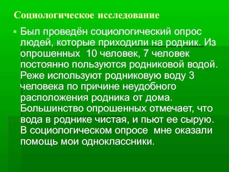 опрошенных 10 человек, 7 человек постоянно пользуются родниковой водой. Реже используют родниковую воду 3 человека по причине неудобного расположения родника от дома. Большинство опрошенных отмечает, что вода в роднике чистая, и пьют ее сырую. В социологическом опросе мне оказали помощь мои одноклассники.