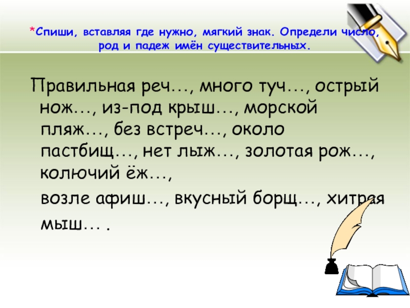 Слайд 52*Спиши, вставляя где нужно, мягкий знак. Определи число, род и падеж