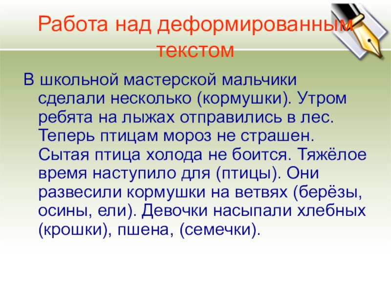 ребята на лыжах отправились в лес. Теперь птицам мороз не страшен. Сытая птица холода не боится. Тяжёлое время наступило для (птицы). Они развесили кормушки на ветвях (берёзы, осины, ели). Девочки насыпали хлебных (крошки), пшена, (семечки).