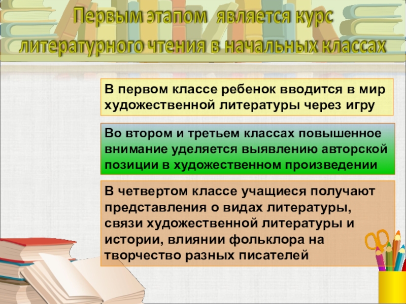 В четвертом классе учащиеся получают представления о видах литературы, связи художественной литературы и истории, влиянии фольклора на творчество разных писателей