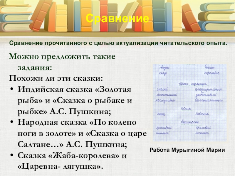 Сравнение прочитанного с целью актуализации читательского опыта.