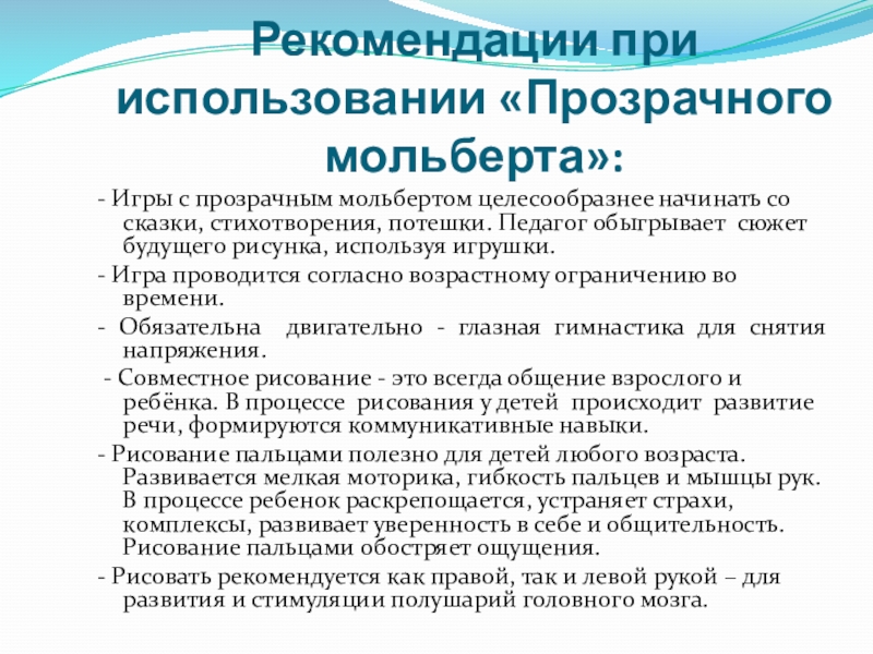 Слайд 4Рекомендации при использовании «Прозрачного мольберта»: