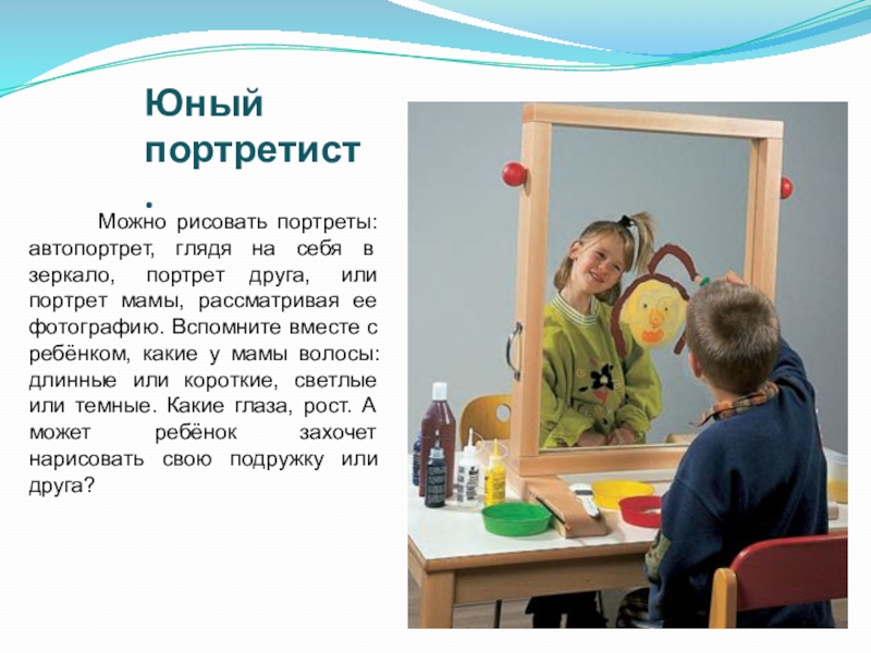 на себя в зеркало, портрет друга, или портрет мамы, рассматривая ее фотографию. Вспомните вместе с ребёнком, какие у мамы волосы: длинные или короткие, светлые или темные. Какие глаза, рост. А может ребёнок захочет нарисовать свою подружку или друга?