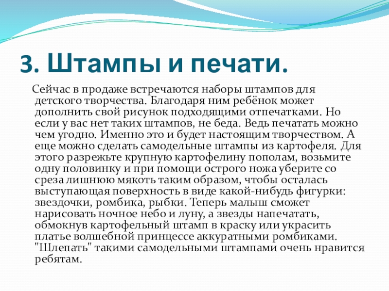 для детского творчества. Благодаря ним ребёнок может дополнить свой рисунок подходящими отпечатками. Но если у вас нет таких штампов, не беда. Ведь печатать можно чем угодно. Именно это и будет настоящим творчеством. А еще можно сделать самодельные штампы из картофеля. Для этого разрежьте крупную картофелину пополам, возьмите одну половинку и при помощи острого ножа уберите со среза лишнюю мякоть таким образом, чтобы осталась выступающая поверхность в виде какой-нибудь фигурки: звездочки, ромбика, рыбки. Теперь малыш сможет нарисовать ночное небо и луну, а звезды напечатать, обмокнув картофельный штамп в краску или украсить платье волшебной принцессе аккуратными ромбиками. "Шлепать" такими самодельными штампами очень нравится ребятам.