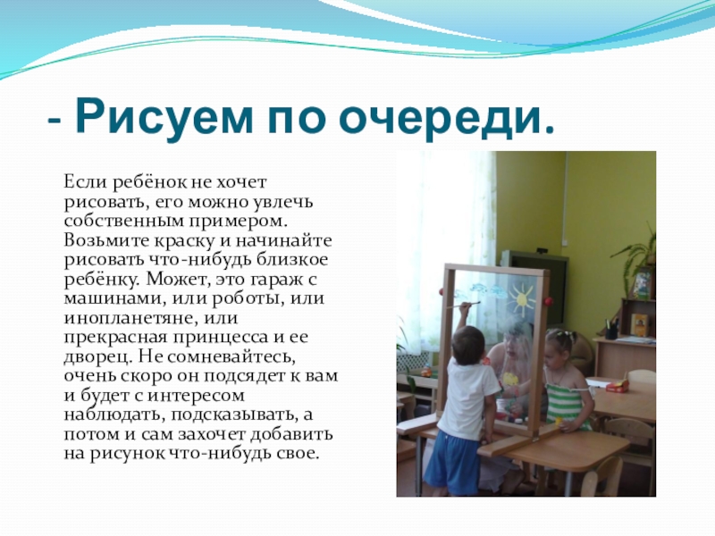 собственным примером. Возьмите краску и начинайте рисовать что-нибудь близкое ребёнку. Может, это гараж с машинами, или роботы, или инопланетяне, или прекрасная принцесса и ее дворец. Не сомневайтесь, очень скоро он подсядет к вам и будет с интересом наблюдать, подсказывать, а потом и сам захочет добавить на рисунок что-нибудь свое.