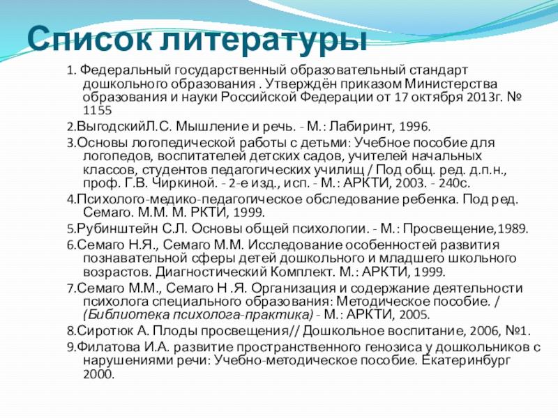 9.Филатова И.А. развитие пространственного генозиса у дошкольников с нарушениями речи: Учебно-методическое пособие. Екатеринбург 2000.