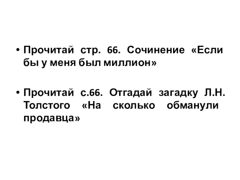 Прочитай стр. 66. Сочинение «Если бы у меня был миллион»Прочитай с.66. Отгадай загадку Л.Н.Толстого «На сколько обманули