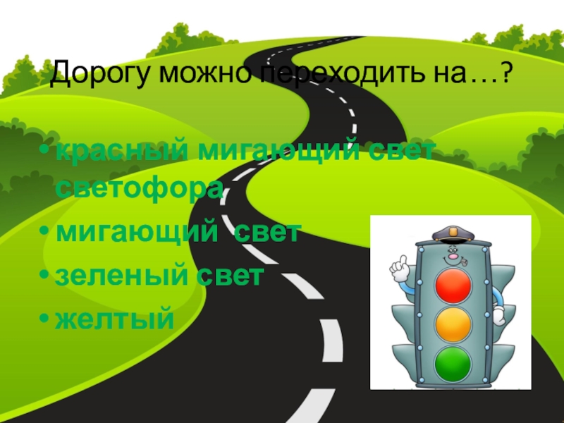 Дорогу можно переходить на…? красный мигающий свет светофорамигающий светзеленый светжелтый