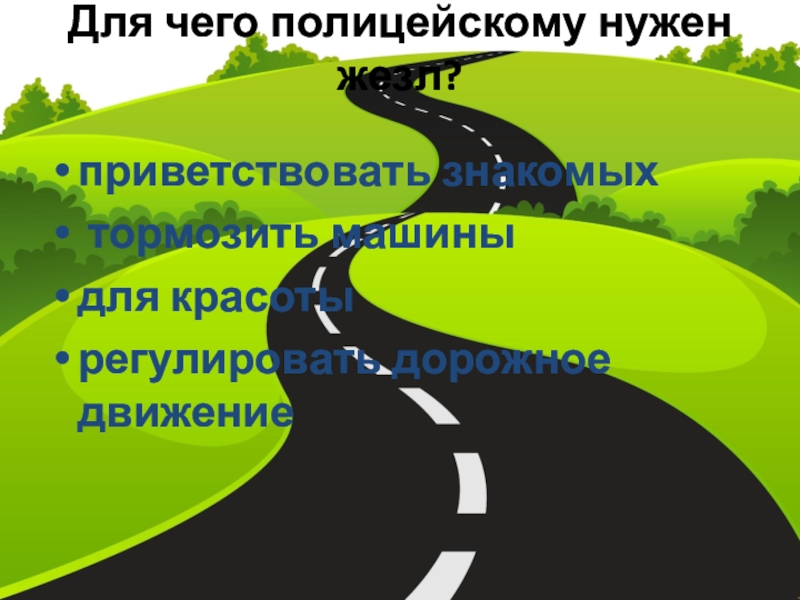 Для чего полицейскому нужен жезл? приветствовать знакомых тормозить машиныдля красотырегулировать дорожное движение