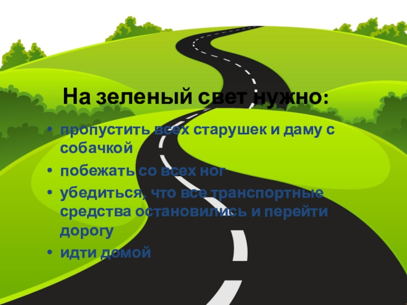 На зеленый свет нужно:пропустить всех старушек и даму с собачкойпобежать со всех ногубедиться, что все транспортные