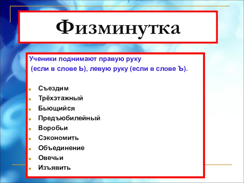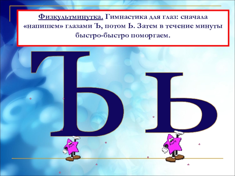 Слайд 15Физкультминутка. Гимнастика для глаз: сначала «напишем» глазами Ъ, потом Ь. Затем