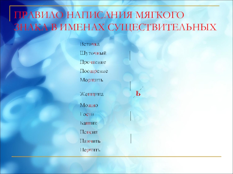Слайд 6ПРАВИЛО НАПИСАНИЯ МЯГКОГО ЗНАКА В ИМЕНАХ СУЩЕСТВИТЕЛЬНЫХ