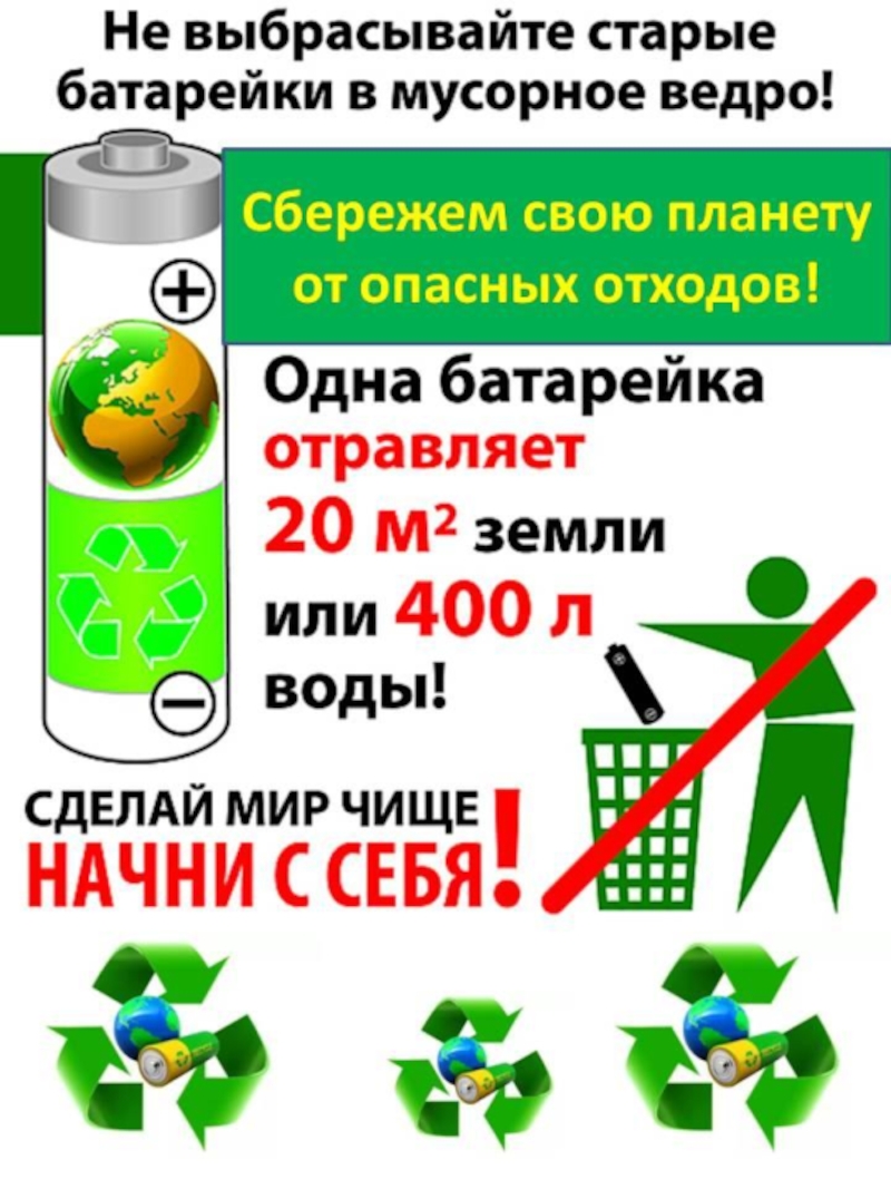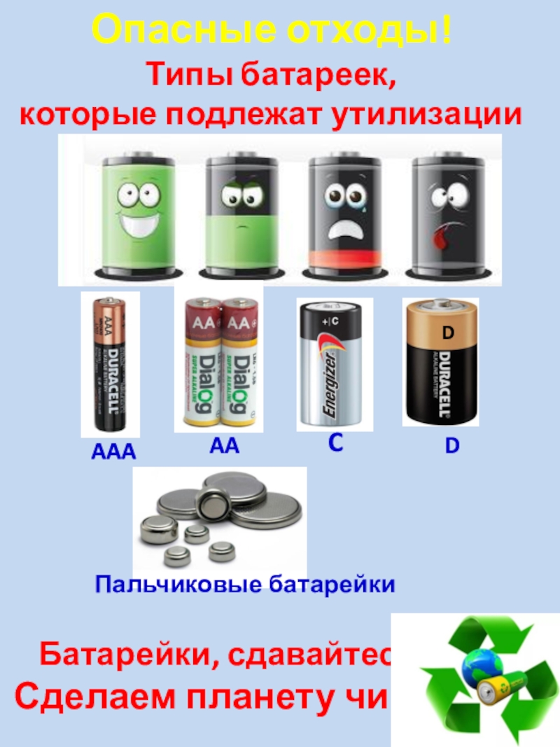 Опасные отходы!Типы батареек, которые подлежат утилизацииБатарейки, сдавайтесь!Сделаем планету чище!