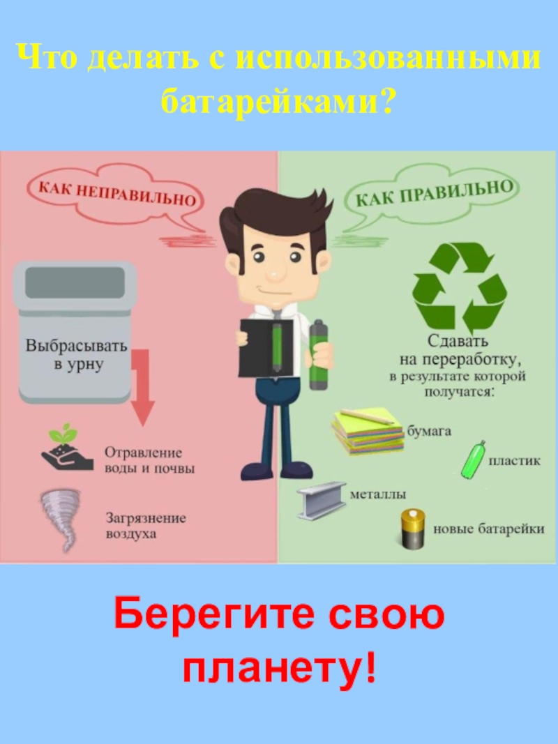 Слайд 4Что делать с использованными батарейками?