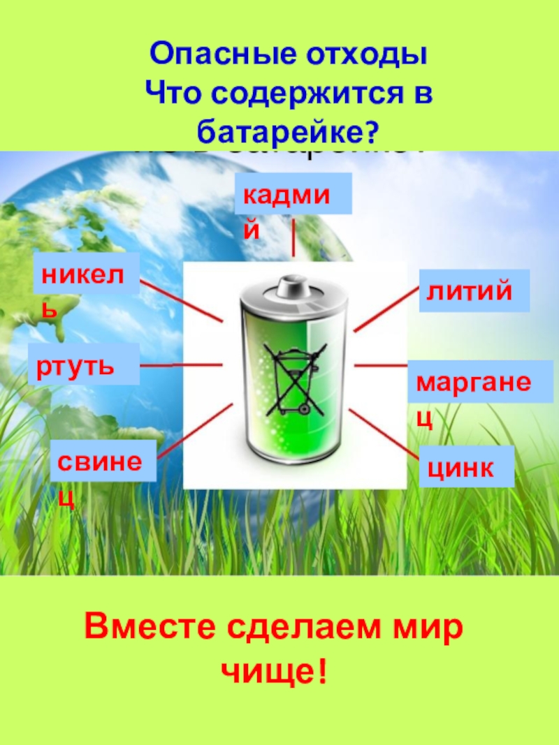 Опасные отходыЧто содержится в батарейке?Вместе сделаем мир чище!