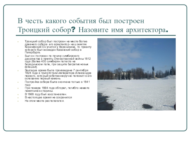 Слайд 26В честь какого события был построен Троицкий собор? Назовите имя архитектора.