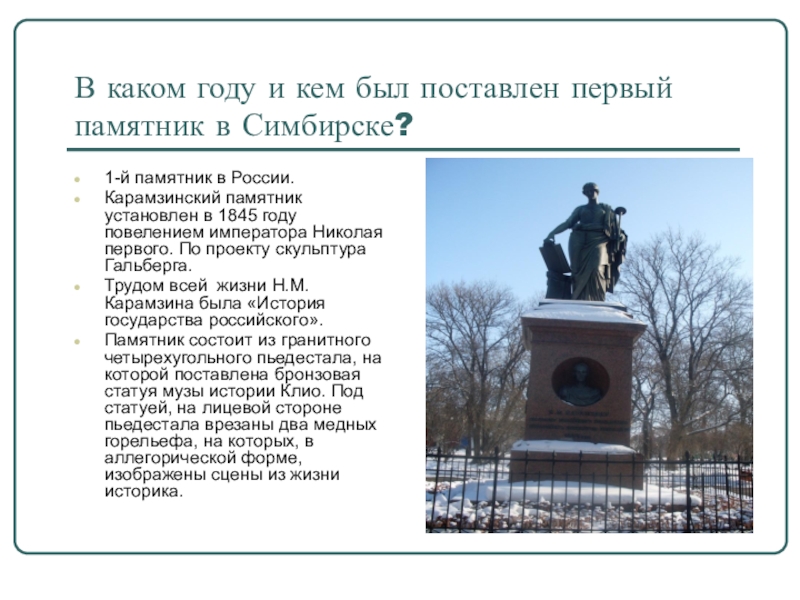 Карамзинский памятник установлен в 1845 году повелением императора Николая первого. По проекту скульптура Гальберга.