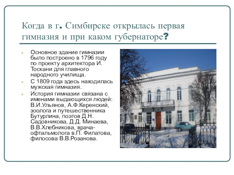 Слайд 14Когда в г. Симбирске открылась первая гимназия и при каком губернаторе?