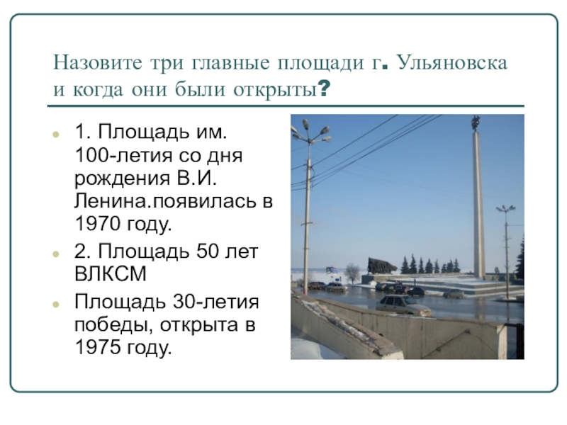 Слайд 19Назовите три главные площади г. Ульяновска и когда они были открыты?