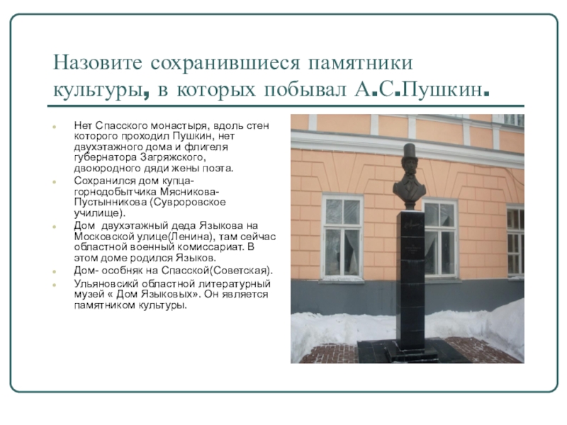 Слайд 29Назовите сохранившиеся памятники культуры, в которых побывал А.С.Пушкин.