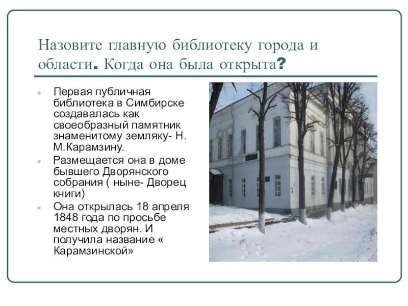 библиотека в Симбирске создавалась как своеобразный памятник знаменитому земляку- Н.М.Карамзину.