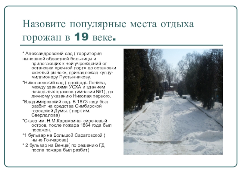 *Владимировский сад. В 1873 году был разбит на средства Симбирской городской Думы. ( парк им. Сверлдлова)