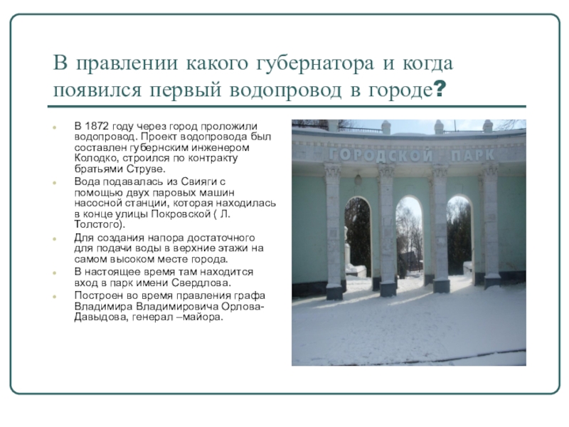 Слайд 13В правлении какого губернатора и когда появился первый водопровод в городе?