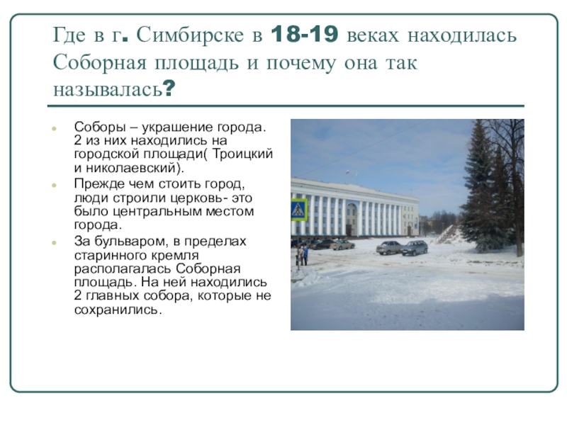 Слайд 25Где в г. Симбирске в 18-19 веках находилась Соборная площадь и