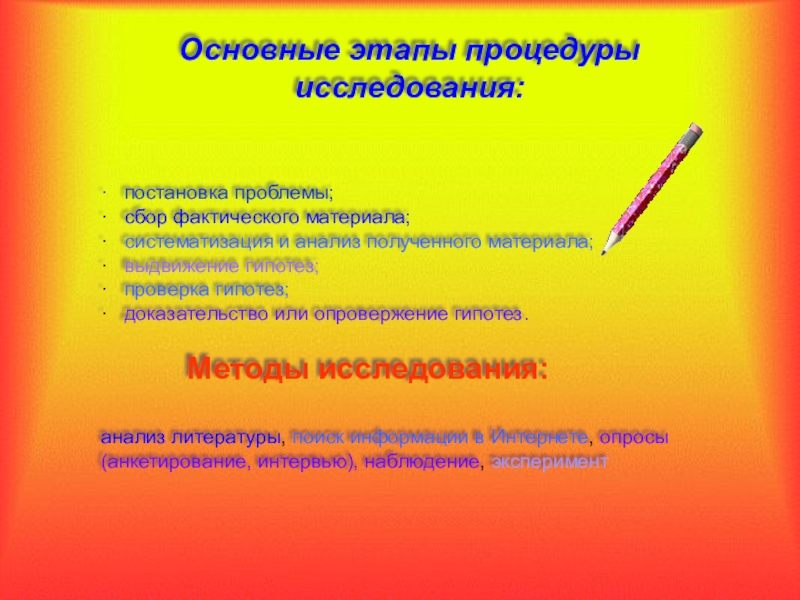 анализ литературы, поиск информации в Интернете, опросы (анкетирование, интервью), наблюдение, эксперимент