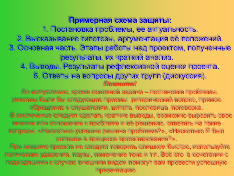 При защите проекта не следует говорить слишком быстро, используйте логические ударения, паузы, изменение тона и т.п. Всё это в сочетании с подходящими к случаю внешним видом помогут вам провести успешную презентацию.