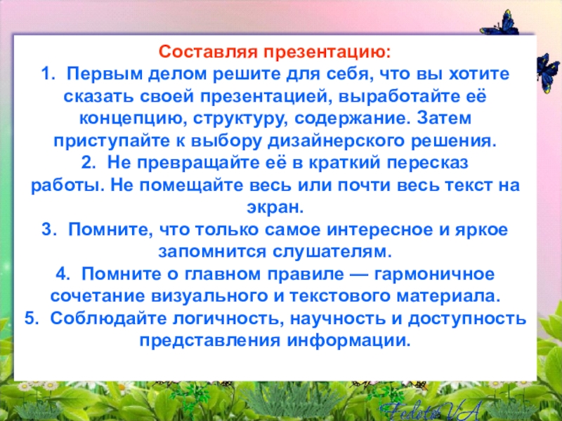 2. Не превращайте её в краткий пересказ работы. Не помещайте весь или почти весь текст на экран.