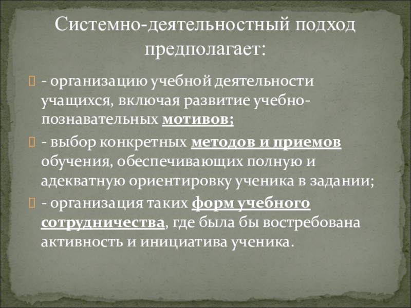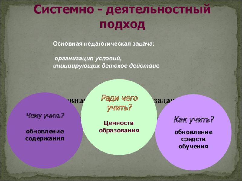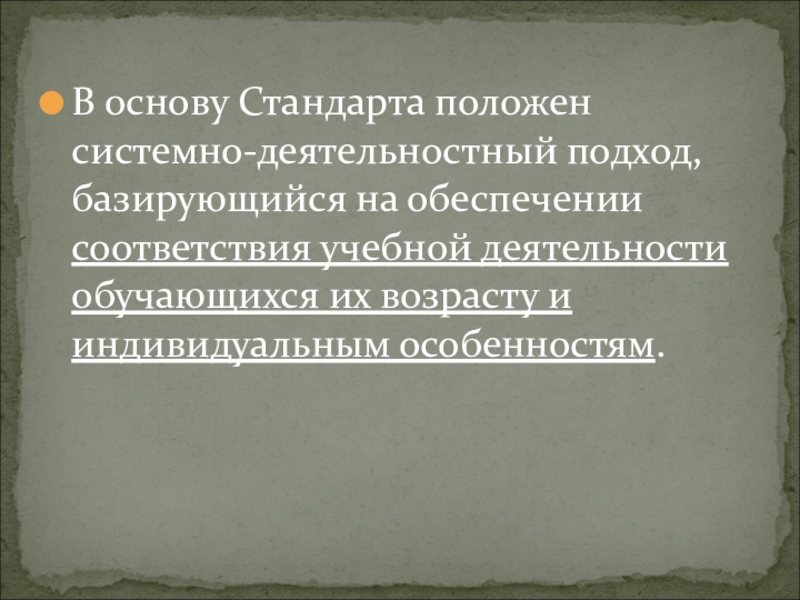 В основу Стандарта положен системно-деятельностный подход, базирующийся на обеспечении соответствия учебной