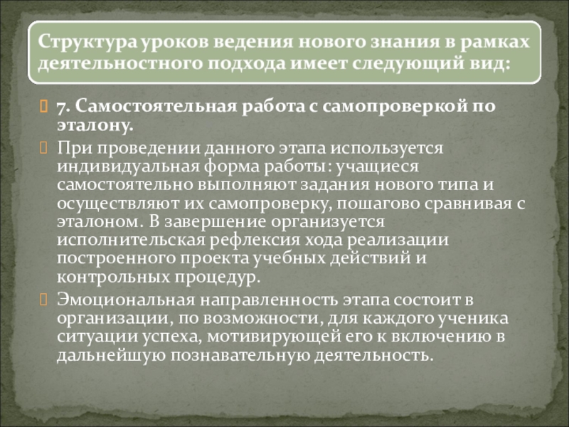 индивидуальная форма работы: учащиеся самостоятельно выполняют задания нового типа и осуществляют их самопроверку, пошагово сравнивая с эталоном. В завершение организуется исполнительская рефлексия хода реализации построенного проекта учебных действий и контрольных процедур.