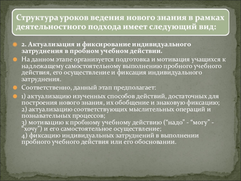 этапе организуется подготовка и мотивация учащихся к надлежащему самостоятельному выполнению пробного учебного действия, его осуществление и фиксация индивидуального затруднения.