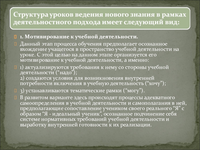 учащегося в пространство учебной деятельности на уроке. С этой целью на данном этапе организуется его мотивирование к учебной деятельности, а именно:
