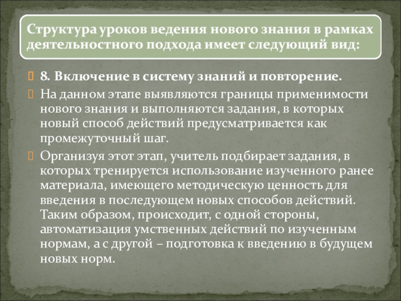 Организуя этот этап, учитель подбирает задания, в которых тренируется использование изученного ранее материала, имеющего методическую ценность для введения в последующем новых способов действий. Таким образом, происходит, с одной стороны, автоматизация умственных действий по изученным нормам, а с другой – подготовка к введению в будущем новых норм.